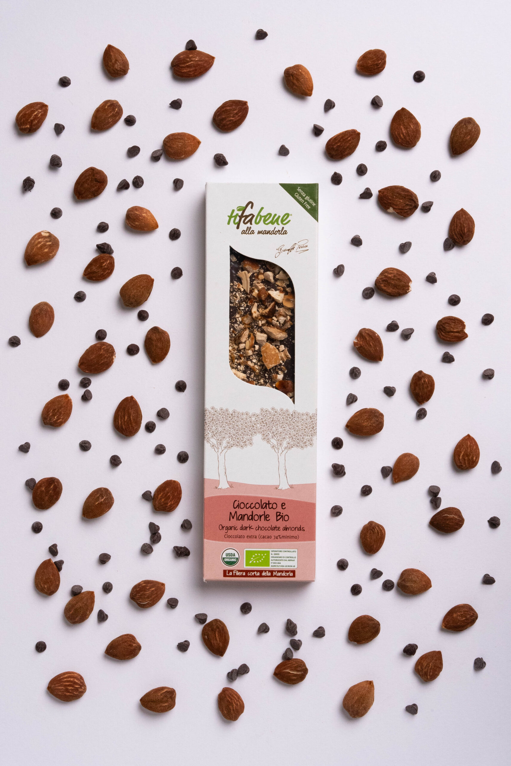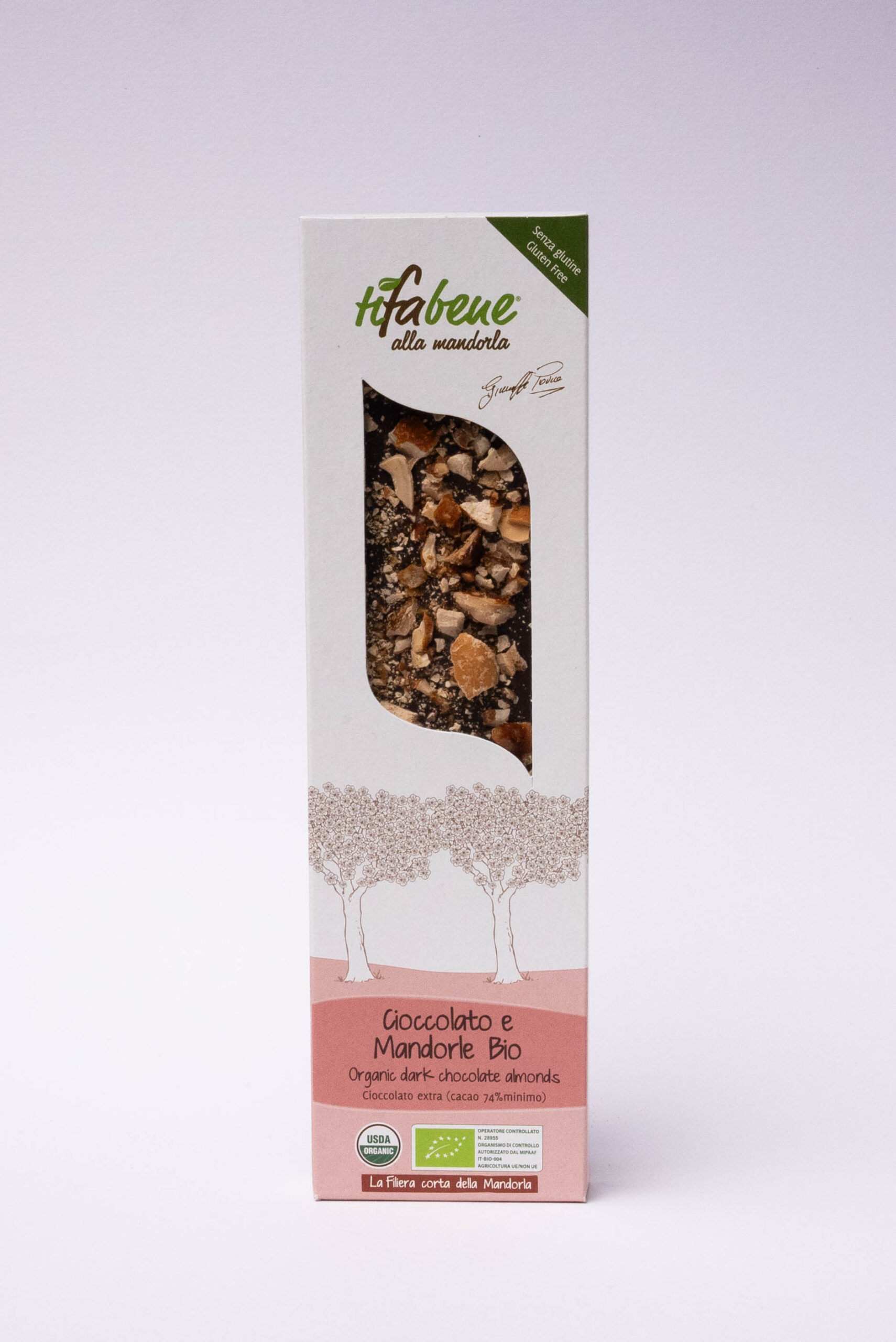 La percentuale di cacao ideale per chi ama il mondo del cioccolato fondente e poi le amate mandorle. Coltivate in un angolo di Puglia, tra reticoli di muretto a secco e trulli. Il paesaggio è quello del Parco nazionale dell’Alta Murgia, ai piedi del Castel del Monte. In questo angolo di Puglia vengono coltivate le mandorle con metodo biologico nel rispetto della biodiversità del territorio. Uno scrigno di innumerevoli proprietà nutrizionali.